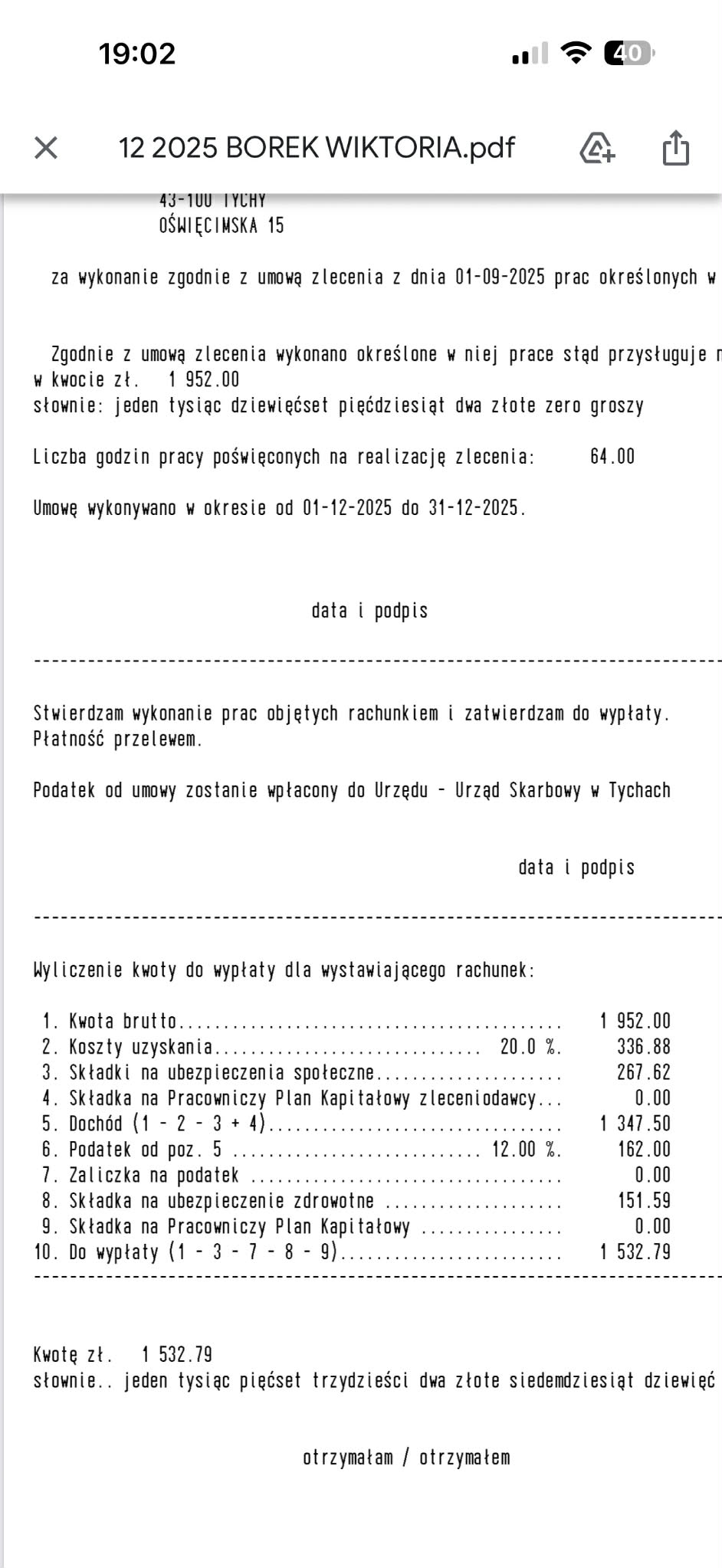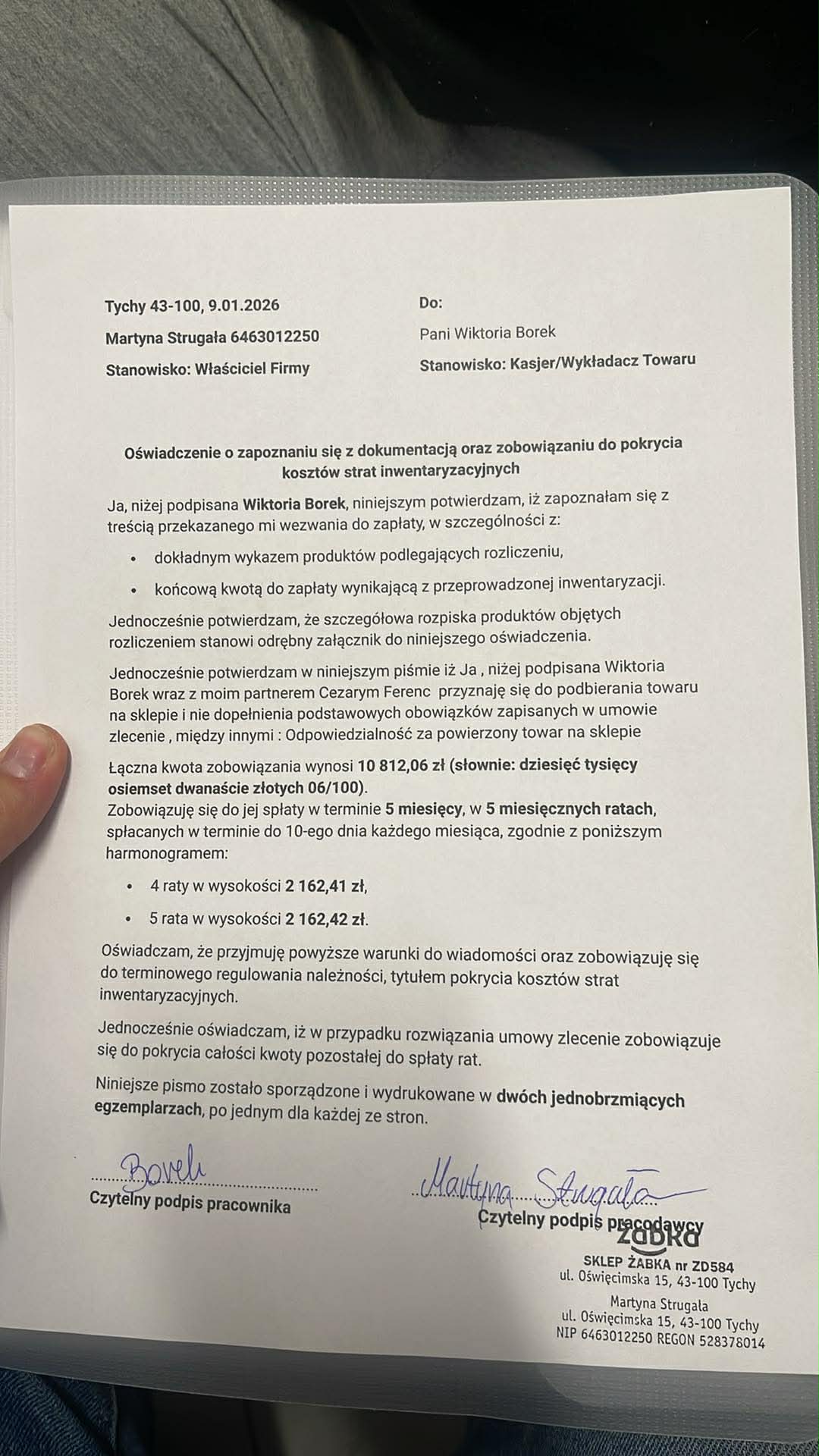 Z załączonego dokumentu wynika, że wykonywała Pani pracę na umowie zlecenia i podpisała Pani oświadczenie/ugodę o spłacie 10 812,06 zł w 5 ratach, z klauzulą, że po rozwiązaniu zlecenia ma Pani dopłacić resztę jednorazowo.