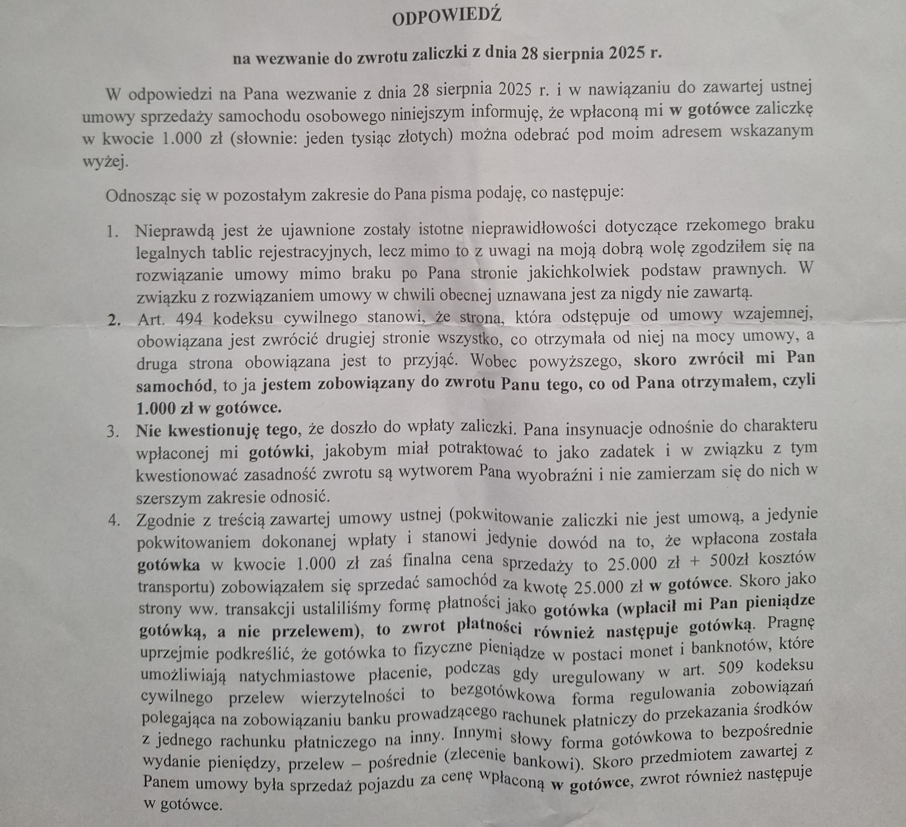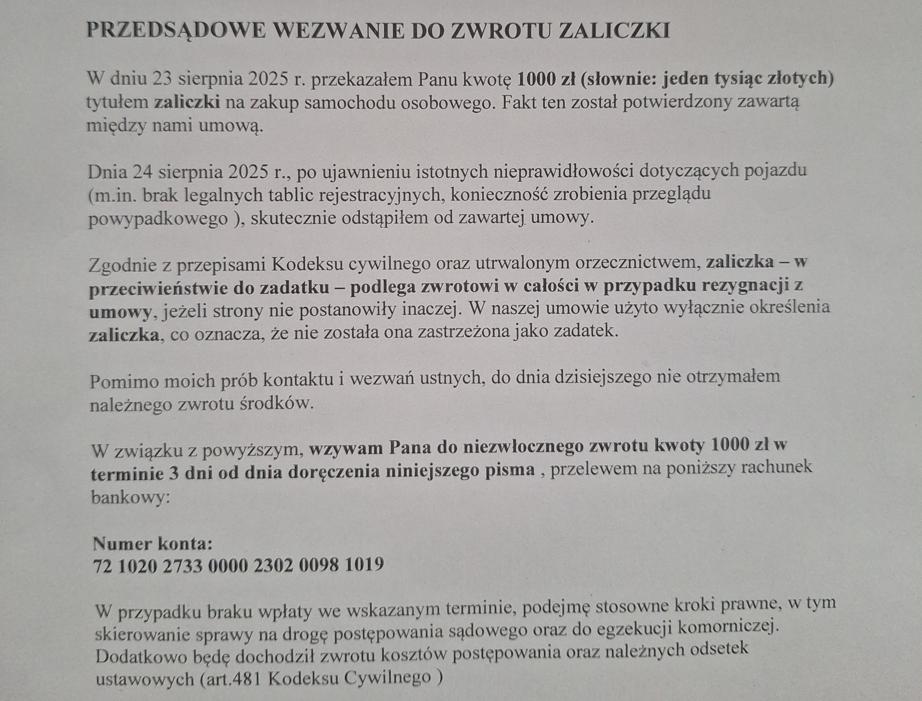 ,W sobotę wpłaciłam zaliczkę 1000 zl na samochód. Spisaliśmy umowę przekazania tej kwoty a resztę szczegółów ustaliliśmy ustnie . Chcialam wrocić samochodem do domu ale okazalo sie iż nie spelnia warunków aby poruszać sie nim po drodze (brak przegladu ,ubezpieczenia , oplaconej akcyzy i rejestracji w polsce ) Miał byc więc dostarczony we wtorek na lawecie . Jednakże w niedziele zrezygnowałam z zakupu gdyż po zastanowieniu auto wydawało sie byc lewe i miało blachy od innego pojazdu . Pan nie chce oddać pieniędzy i na wszelkie sposoby kręci . Obwinia mnie o poniesione koszty opłacenia akcyzy mimo iz on miał auto od maja i jej nie opłacił. Samochód też jest powypadkowy czego w informacji na stronie z pgloszenia nie bylo i ja mam zrobić odpowiedni przegląd . Umowa między nami została spisana na kartce z bloku i zawiera informacje o dacie, miejscu i kwocie zaliczki na samochód bmw z podanym numerem rejestracyjnym i podpisem sprzedającego. Dodatkowo znajduje sie informacja iz pozostała kwota to 24 tysiące do zapłaty za samochód +500 zl laweta . Wysyłałam wiadomości do tego pana , prosiłam o przelew pieniędzy na konto gdyż mam do niego 80 km i całkowicie mu nie ufam a nawet tak jak zamieściłam w załączniku wysłałam pismo . Człowiek ten sprytnie choć nie zawsze umiejętnie manewruje w przepisach prawa i próbuje odwracać sytuację, powoływać sie na insynuacje których nigdy nie było oraz manipuluje sprawą od początku. Proszę o porade co mogę w takiej sytuacji zrobić i jak odzyskać swoją zaliczkę. Nadmienię również ze samochód o którym mowa byl cały czas na posesji tego Pana wraz z dokumentami .