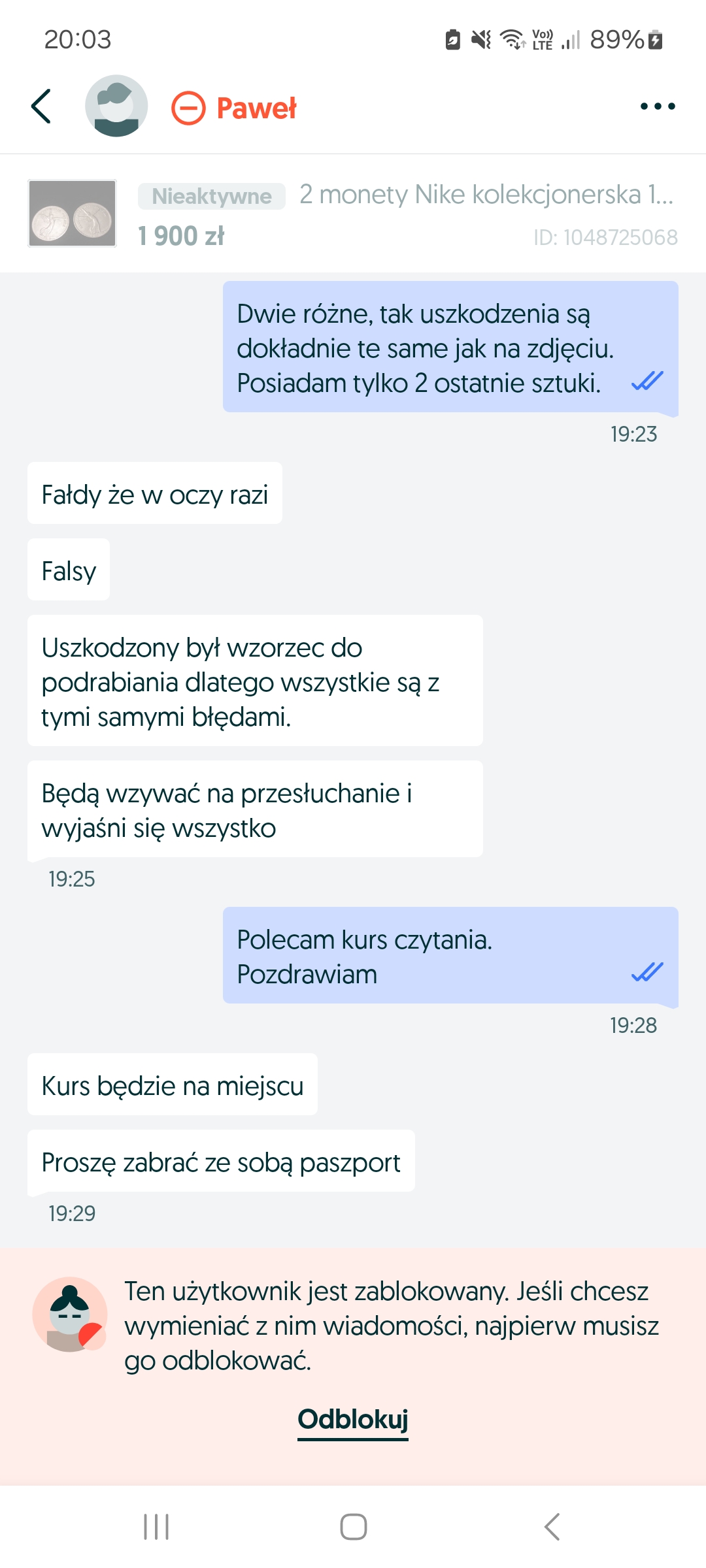 Podsumowanie dla Pana sytuacjiPrzy braku transakcji, braku potwierdzenia autentyczności i wycofaniu ogłoszenia, najczęściej kończy się na „straszeniu”. Realny problem pojawia się głównie wtedy, gdy to fałszywe środki płatnicze albo gdy ktoś sprzedaje jako oryginał, wiedząc że to podróbka.